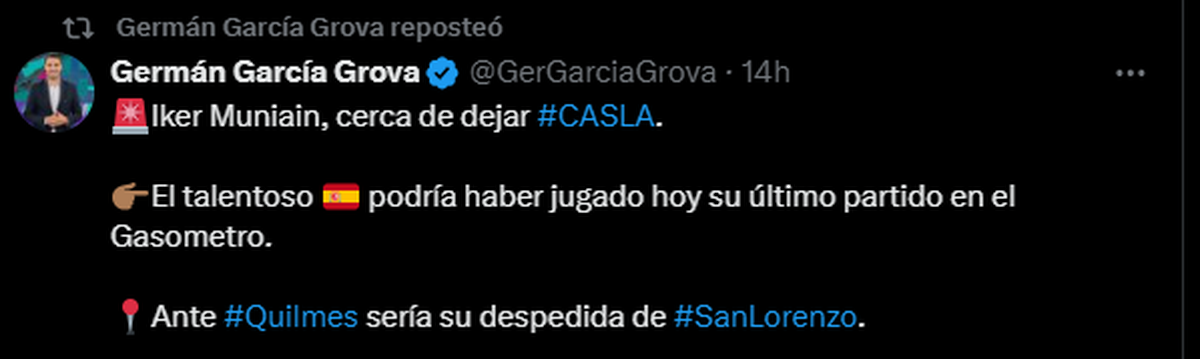 Es decir, tal como menciona García Grova, no sería ilógico que Muniain deje el club de Boedo en el siguiente mercado de pases.