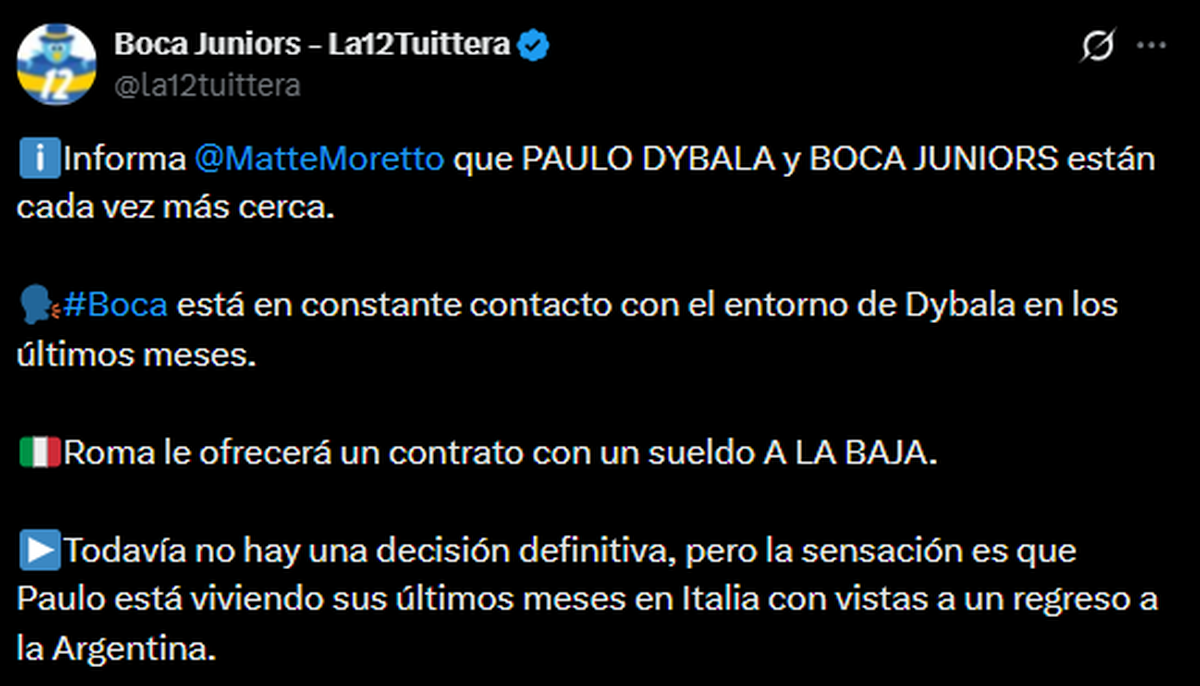 Además, La 12 Tuittera, uno de los medios partidarios más influyentes en X vinculados al Xeneize, amplió la información brindada por el periodista italiano: “Todavía no hay una decisión definitiva, pero la sensación es que Paulo está viviendo sus últimos meses en Italia con vistas a un regreso a la Argentina”.