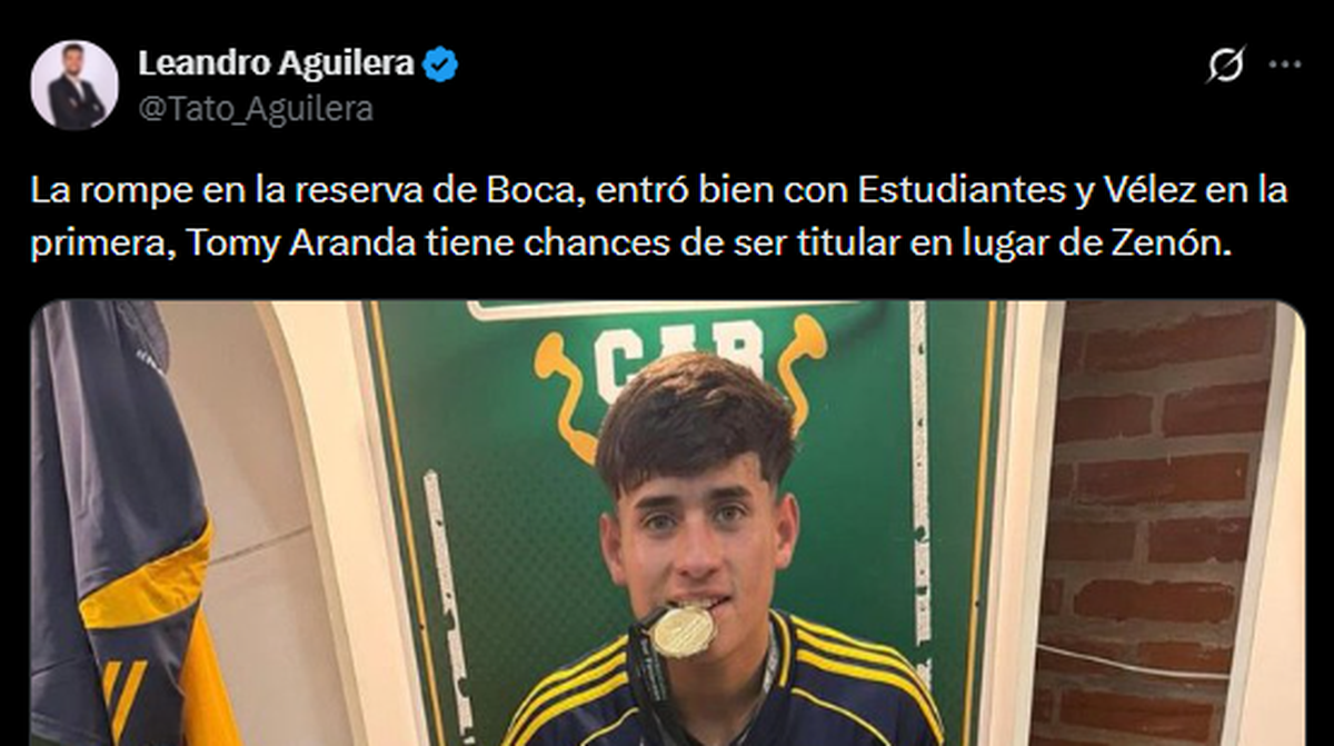 “La rompe en la Reserva de Boca, entró bien con Estudiantes y Vélez en Primera. Tomy Aranda tiene chances de ser titular en lugar de Zenón”, aseguró el periodista de TyC Sports.