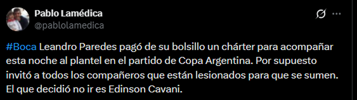 El periodista Pablo Lamédica informó: “Leandro Paredes pagó de su bolsillo un chárter para acompañar esta noche al plantel en el partido de Copa Argentina. Por supuesto, invitó a todos los compañeros que están lesionados para que se sumen”. Y agregó: “El que decidió no ir es Edinson Cavani”.