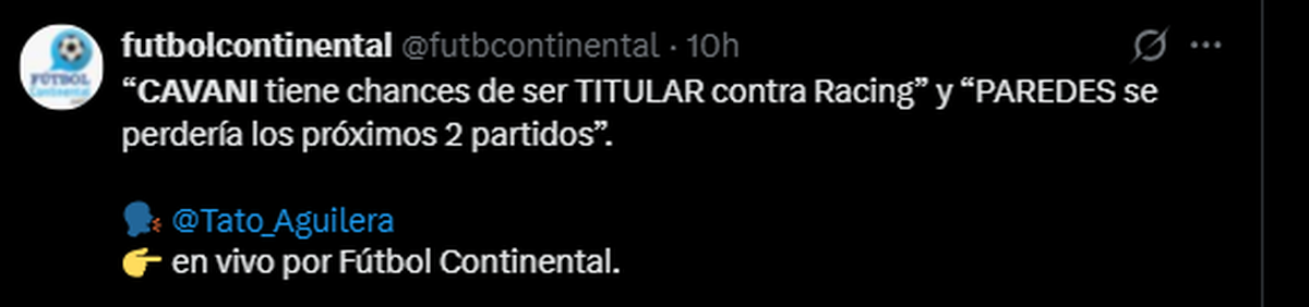 Por su parte, Julio Pavoni, otro de los periodistas especializados en la actualidad de Boca, aseguró que Claudio Úbeda modificaría el esquema y que frente a Racing el equipo se parará con un 4-4-2. Merentiel tendría su lugar asegurado desde el arranque, mientras que resta definir si su acompañante será Cavani u otro futbolista.