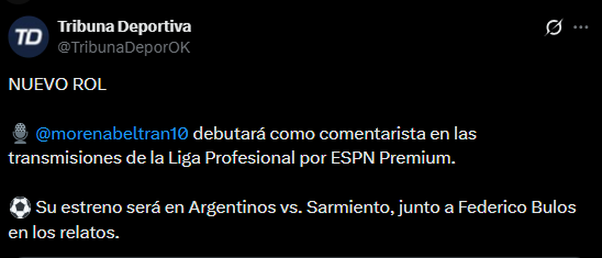 En las últimas horas se conoció una novedad que sorprendió a propios y extraños. El medio Tribuna Deportiva, especializado en información vinculada a medios y transmisiones deportivas, confirmó: “Morena Beltrán debutará como comentarista en las transmisiones de la Liga Profesional por ESPN Premium. Su estreno será en Argentinos vs. Sarmiento, junto a Federico Bulos en los relatos”.