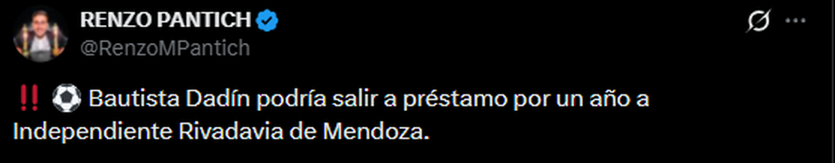 En este contexto, el delantero juvenil Bautista Dadín, que puede desempeñarse como centrodelantero, se marchará a Independiente Rivadavia de Mendoza, equipo que disputará la Copa Libertadores en 2026.