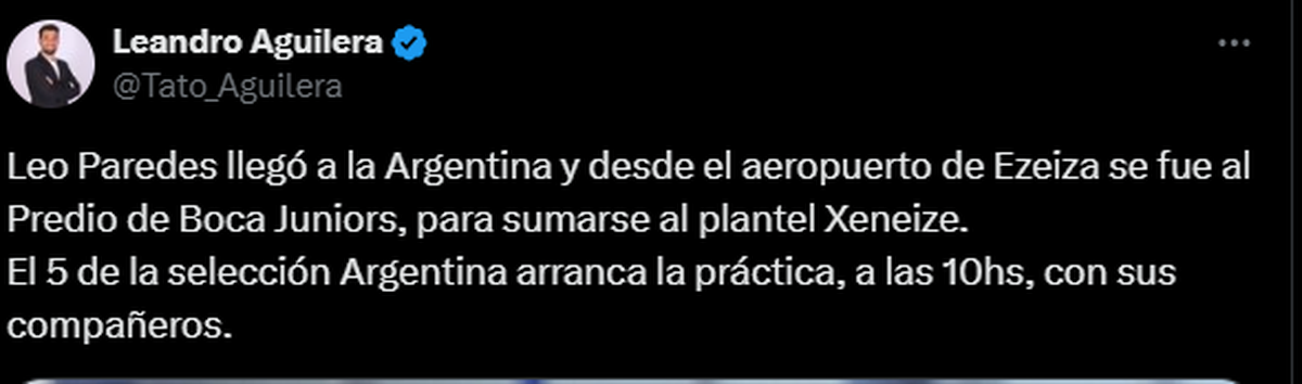 Por el lado de Leandro Paredes, Tato Aguilera informó: "Leo Paredes llegó a la Argentina y desde el aeropuerto de Ezeiza se fue al Predio de Boca Juniors, para sumarse al plantel Xeneize.".