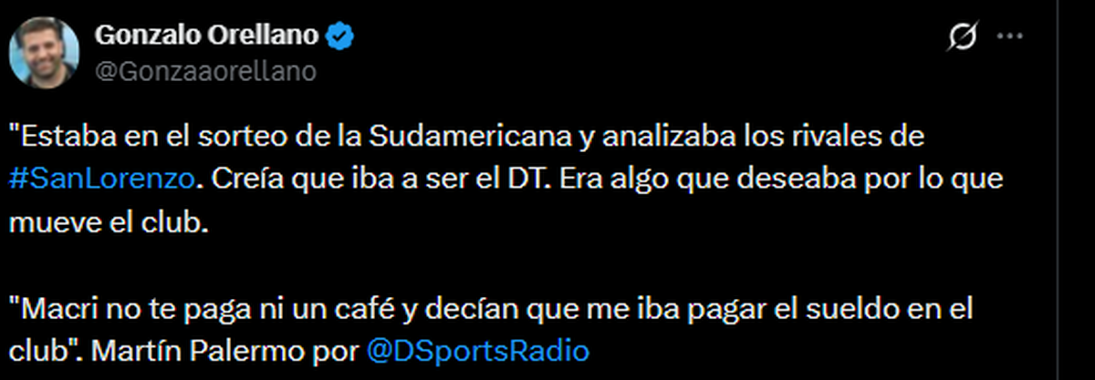 Tras estas versiones, el exdelantero de Boca Juniors se expresó al respecto y brindó su versión sobre por qué no llegó al Cuervo, además de referirse a Macri. En diálogo con DSports, el entrenador afirmó: “Macri no te paga ni un café y decían que me iba a pagar el sueldo en San Lorenzo... Cuando meten la política se empieza a desvirtuar todo. Yo tengo una amistad, fue presidente de Boca, pero después todo lo demás es ajeno.”