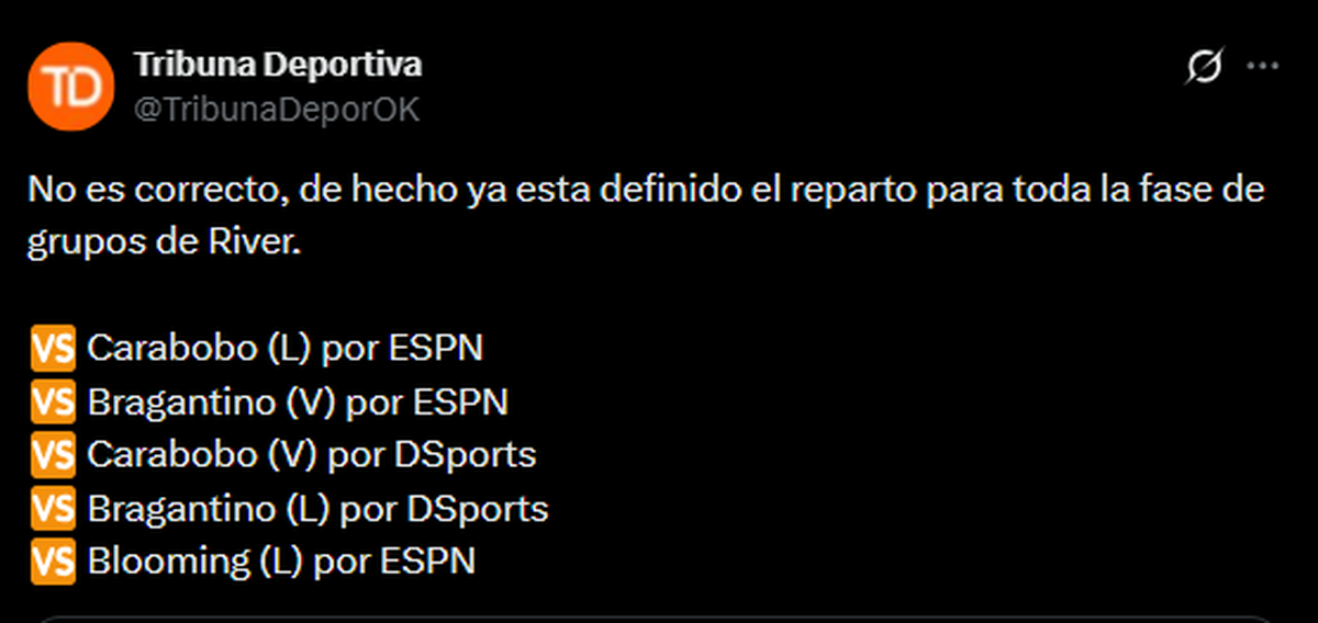 No obstante, el medio Tribuna Deportiva, reconocido en la red social X por difundir información vinculada a los derechos televisivos, contradijo esta versión y publicó: “No es correcto, de hecho ya está definido el reparto para toda la fase de grupos de River.”