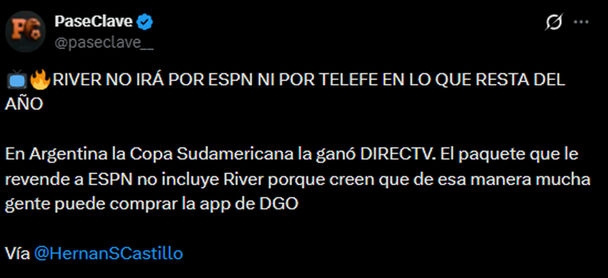 En esta sintonía, el periodista Hernán Castillo dio a conocer un dato aún más desalentador: “En Argentina, la Copa Sudamericana la ganó DIRECTV. El paquete que le revende a ESPN no incluye a River porque creen que, de esa manera, mucha gente puede comprar la app de DGO”, aseguró.