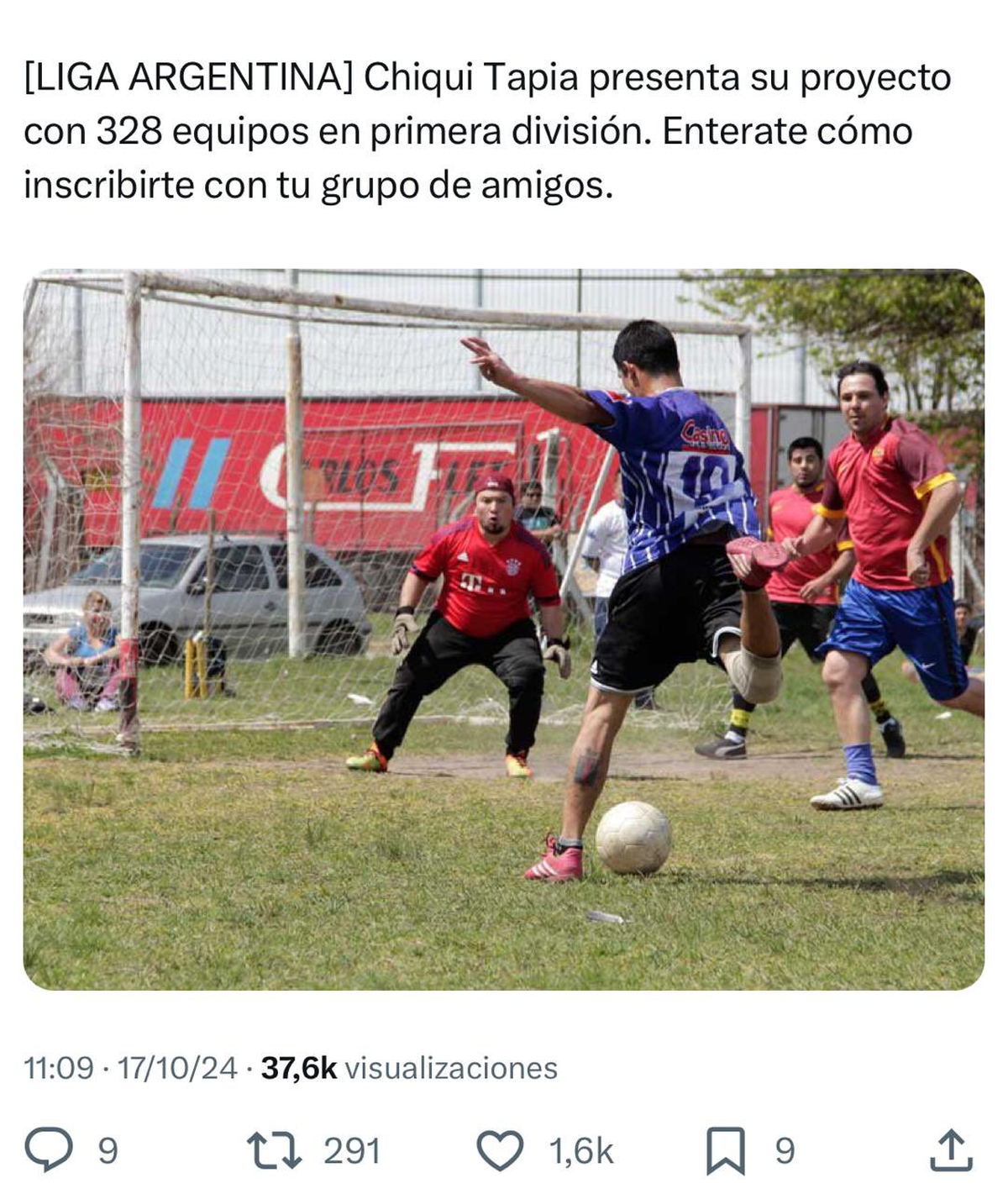 Entendiendo la cantidad de equipos que habrán en primera, subió una foto a X con un texto que dice: "[LIGA ARGENTINA] Chiqui Tapia presenta su proyecto con 128 equipos en primera división. Enterate cómo inscribirte con tu grupo de amigos"