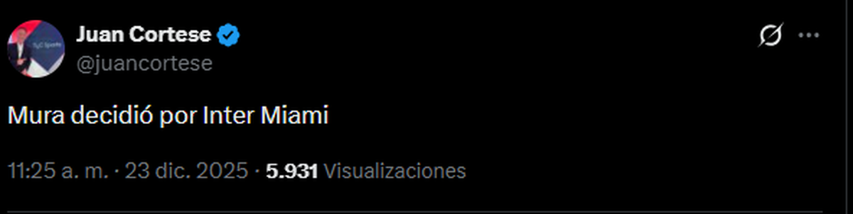 "Mura decidió por Inter Miami", aseguró el periodista Juan Cortese, confirmando el futuro del defensor.