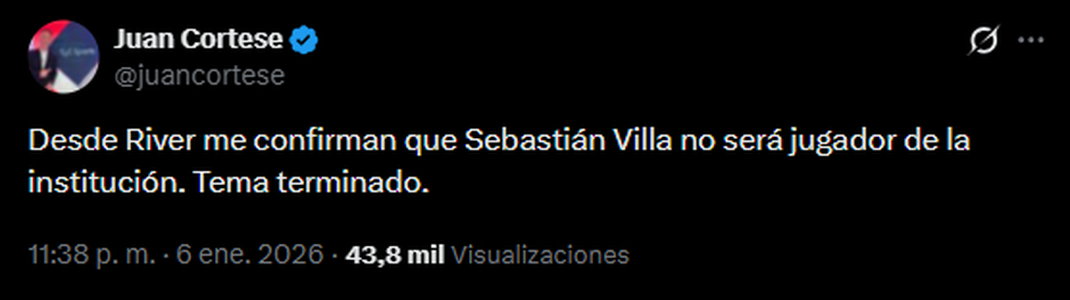 Juan Cortese, uno de los periodistas de TyC Sports que sigue el día a día de River, se alineó con la postura de Tabares. “Desde River me confirman que Sebastián Villa no será jugador de la institución. Tema terminado”, sentenció el periodista, dándole cierre a una novela que parece todavía algo lejos de resolverse.