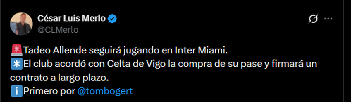 En el caso de Allende, César Luis Merlo confirmó: “Tadeo Allende seguirá jugando en Inter Miami. El club acordó con Celta de Vigo la compra de su pase y firmará un contrato a largo plazo”.