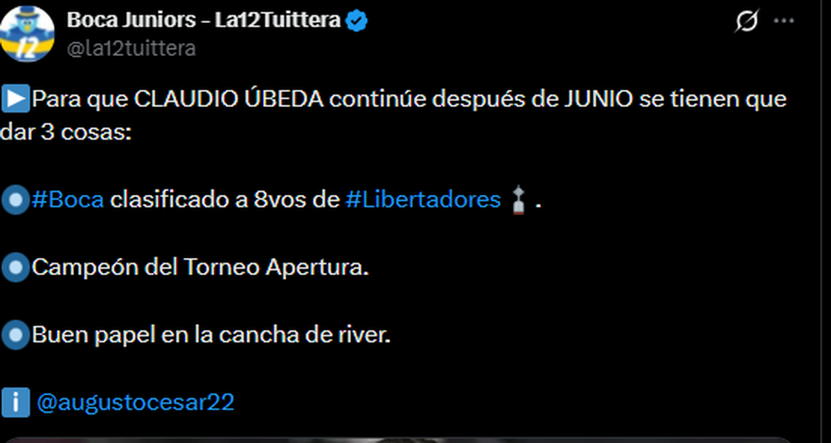 El periodista Augusto César reveló que, en caso de pretender seguir en el cargo, Úbeda deberá cumplir con tres objetivos clave: alcanzar los octavos de final de la Copa Libertadores, consagrarse en el Torneo Apertura 2026 y mostrar un buen rendimiento en el estadio de River.