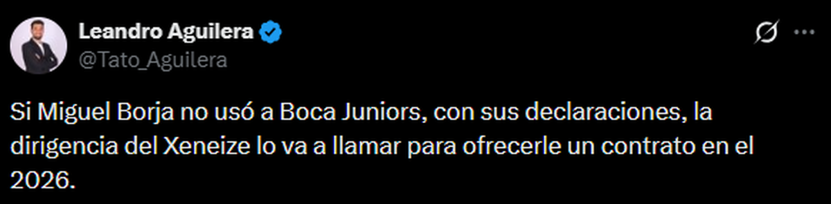 En Sportia, Aguilera aseguró: “Si Borja no usó a Boca para posicionarse en el mercado, tengo la confirmación de que Boca lo va a llamar a Miguel Borja para negociar”. Y luego amplió: “Boca le va a hacer una oferta formal. Llamó a México y fue descartando el interés de algunos clubes que estaban merodeando”.