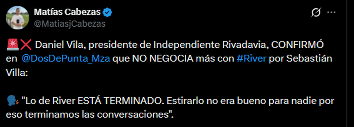 Luego de varios idas y vueltas con River, Independiente Rivadavia tomó una decisión importante con Sebastián Villa.