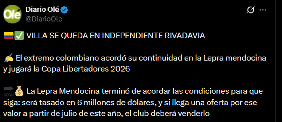 El periodista colombiano especializado en mercado de pases, Pipe Sierra, dejó en claro el acuerdo al que llegaron el club y el futbolista. “Hoy (ayer 22 de enero) vuelve Sebastián Villa (29) a Mendoza y estará de nuevo en la concentración de Independiente Rivadavia. Con el extremo establecieron una cláusula de salida de 6M$ a partir de junio de 2026. Si antes llega un interesado, deberá ofertar una cifra superior a la establecida”, expresó.