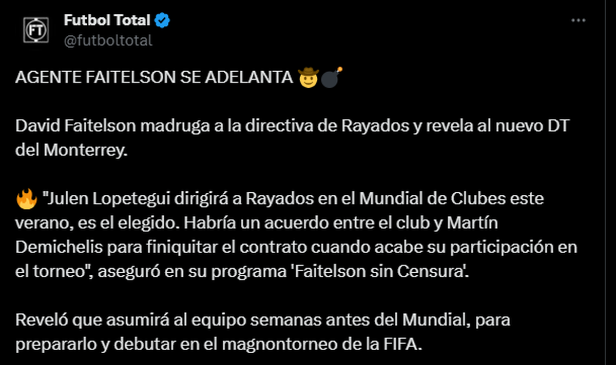 Por tal motivo, el periodista David Faitelson aseguró: “El español Julen Lopetegui dirigirá a los Rayados de Monterrey en el Mundial de Clubes de este verano. Ya habría un acuerdo entre el club y Martín Demichelis para finiquitar el contrato cuando termine la participación de Rayados en el campeonato que incluye Play-in o Liguilla”.