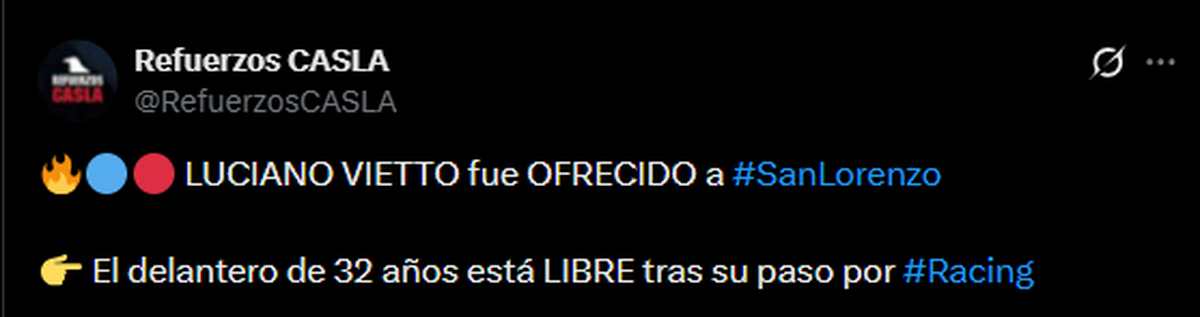 En ese contexto, el periodista Martín Idaberry aseguró en las últimas horas: “Luciano Vietto tiene chances de ser jugador de San Lorenzo. Hay interés de ambas partes. El jugador está libre después de su paso por Racing”.