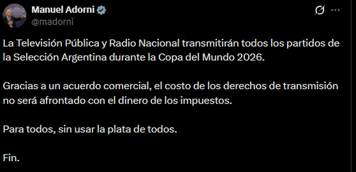 "La Televisión Pública y Radio Nacional transmitirán todos los partidos de la Selección Argentina durante la Copa del Mundo 2026. Gracias a un acuerdo comercial, el costo de los derechos de transmisión no será afrontado con el dinero de los impuestos. Para todos, sin usar la plata de todos. Fin."