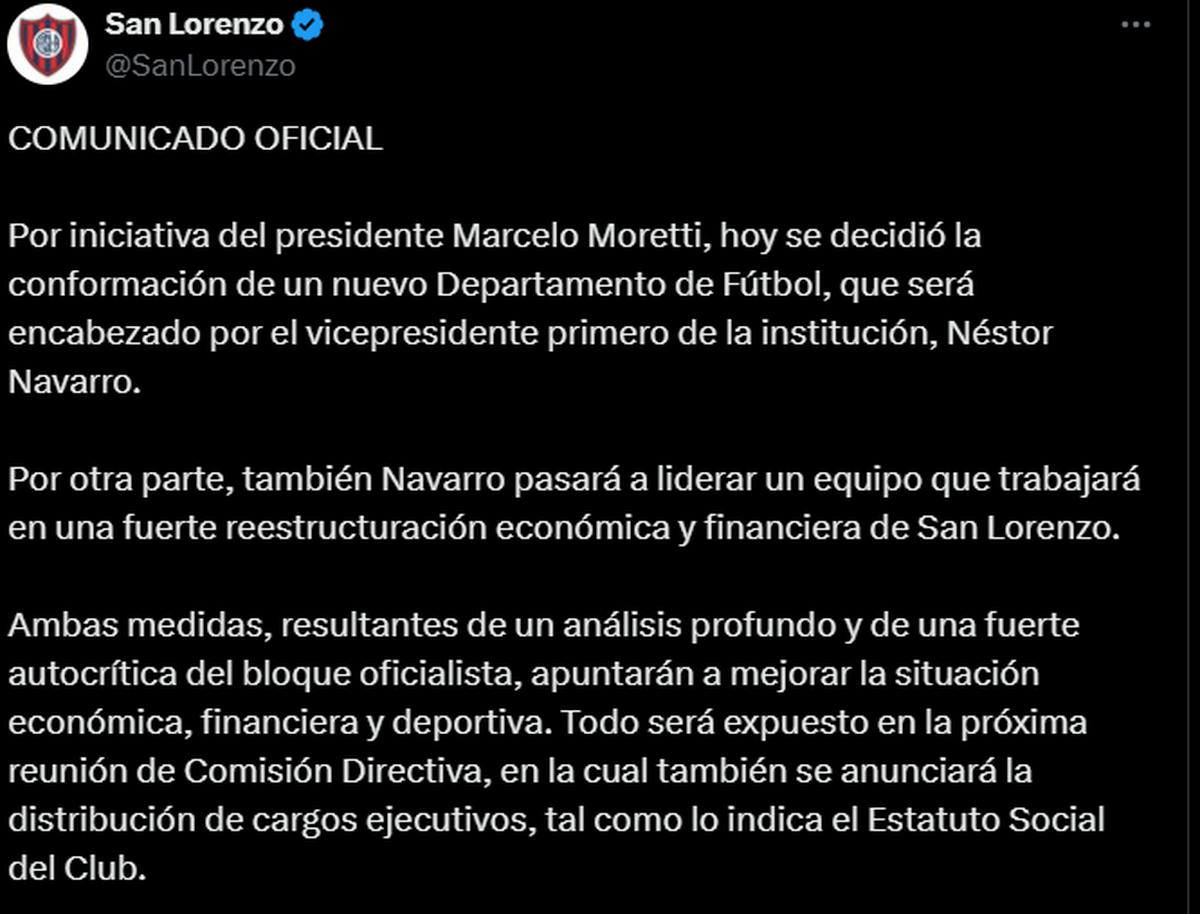 Hace ya algunas semanas, se produjo un cambio de estructura dirigencial en el club de Boedo. Si bien Marcelo Moretti sigue siendo el presidente, no tiene el mismo poder. Sobre todo, porque Néstor Navarro (vicepresidente 1°) es quien desde el comunicado emitido por el club el 16 de diciembre pasado, tiene más poder.
