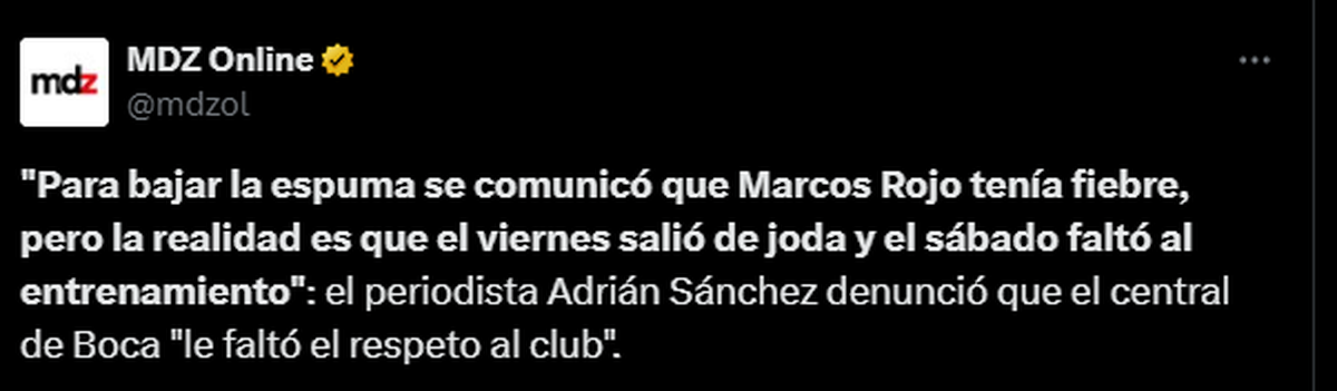 En AZZ, canal de Flavio Azzaro, fueron contundentes con lo que pasó con Rojo. Adrián Sánchez, periodista de dicho canal, dijo: "Para bajar la espuma se comunicó que Marcos Rojo tenía fiebre, pero la realidad es que el viernes salió de joda y el sábado faltó al entrenamiento". Esta información fue dada a la mañana y se siguió con esta temática durante todo el día.
