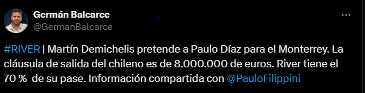 Según informaron los periodistas Germán Balcarce y Paulo Filippini "Martín Demichelis pretende a Paulo Díaz para el Monterrey.". Cabe aclarar también que la cláusula de salida del chileno es de 8.000.000 de euros y River tiene el 70 % de su pase.