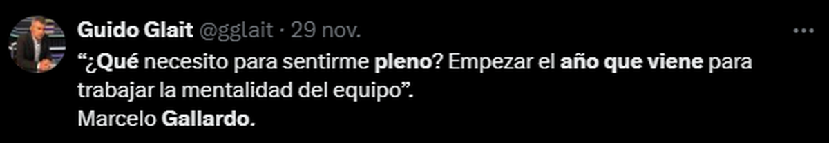 Por otro lado, Marcelo Gallardo habló que lo motiva o lo "llena" pensar en el año que viene en donde las energías se renueven. Por lo que si bien al club de Nuñez le restan partidos, el Muñeco debe empezar a tener en mente una renovación de cara al 2025, que no es un año más.