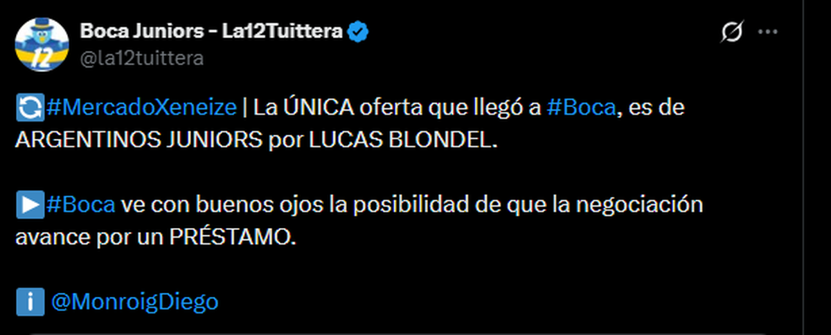 Aunque varios clubes fueron vinculados con su futuro, en las últimas horas el periodista Diego Monroig brindó una confirmación clave: “La única oferta que llegó a Boca es de Argentinos Juniors por Lucas Blondel. En el club ven con buenos ojos que la negociación avance a través de un préstamo”.