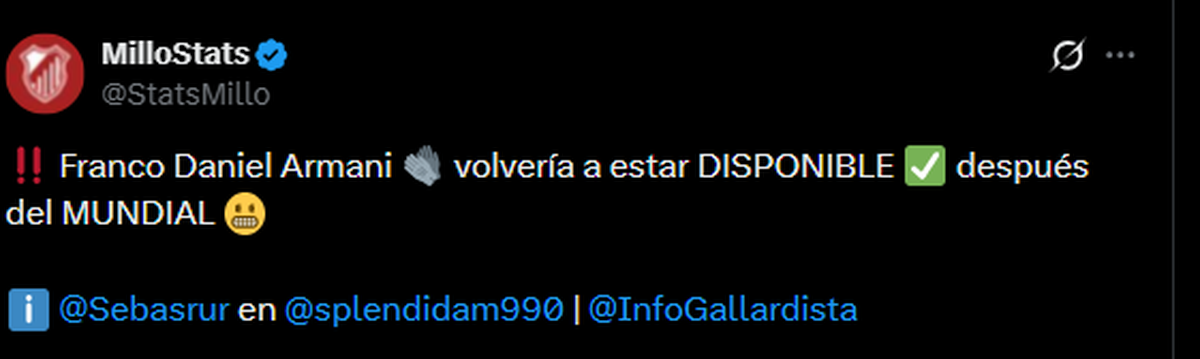 Según el periodista Sebastián Srur, Armani volvería a estar disponible después del Mundial. Es decir, si se mantiene este escenario, el arco seguirá en manos del juvenil.