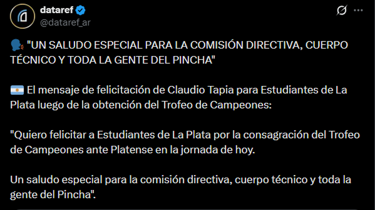 “Quiero felicitar a @edelpoficial por la consagración del Trofeo de Campeones ante Platense en la jornada de hoy. Un saludo especial para la Comisión Directiva, cuerpo técnico y toda la gente del Pincha”, escribó Chiqui Tapia.