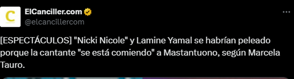 El medio El Canciller, publicó: "Nicki Nicole y Lamine Yamal se habrían peleado porque la cantante 'se está comiendo' a Mastantuono, según Marcela Tauro".