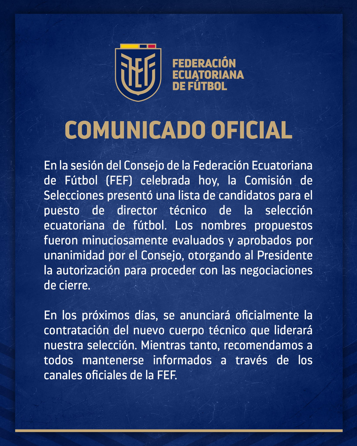 Luego de una danza de nombres extensa que tuvo a Eduardo Domínguez, Fernando Gago, Marcelo Gallardo Fernando Batista, entre otros, la FEF ya tiene su entrenador. Hace algunas horas elevó un comunicado mediantes sus redes (X) dando a entender que proximamente se conocerá quién dirigirá el seleccionado ecuatoriano.