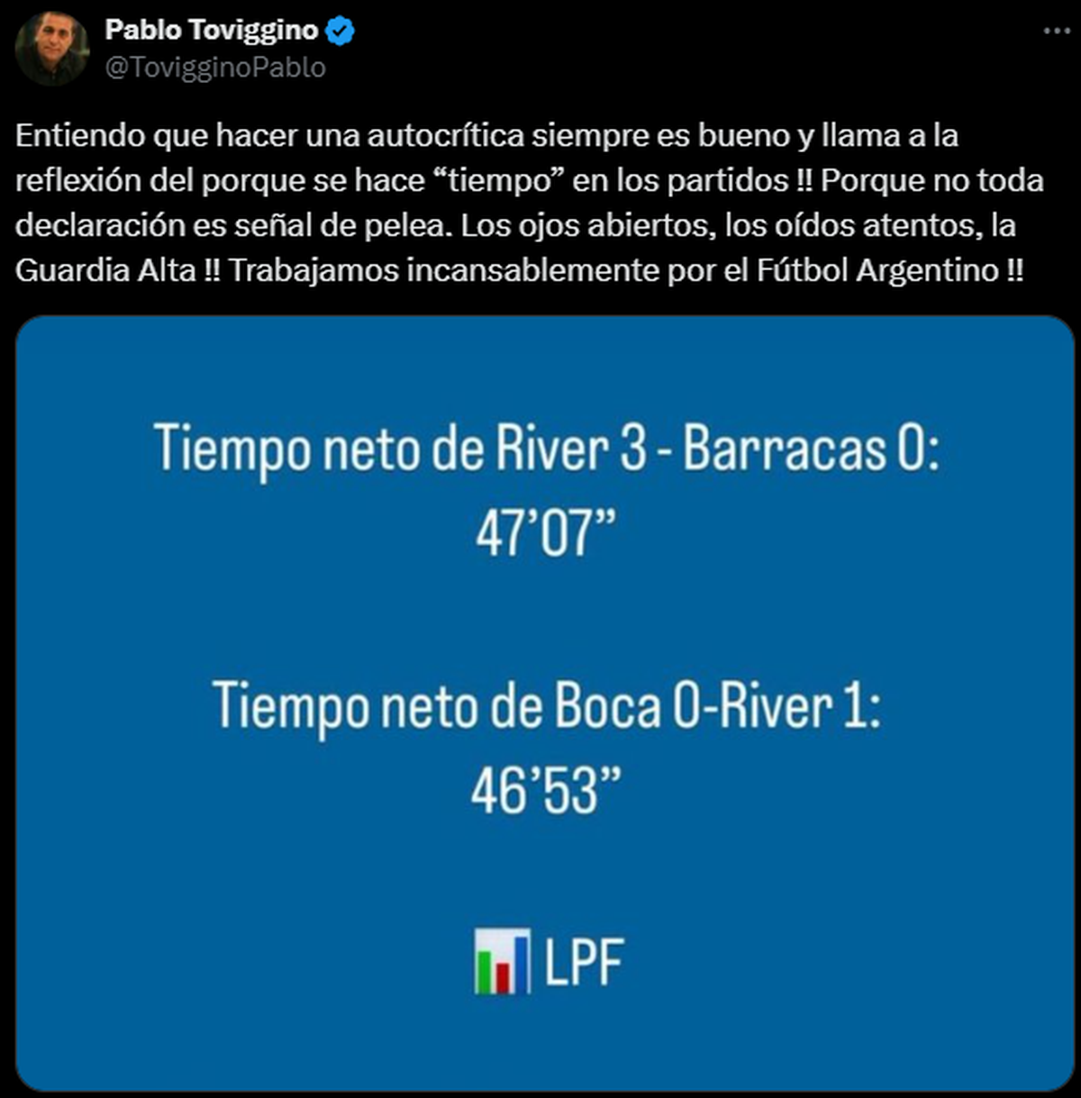 "Entiendo que hacer una autocrítica siempre es bueno y llama a la reflexión del porque se hace “tiempo” en los partidos !! Porque no toda declaración es señal de pelea. Los ojos abiertos, los oídos atentos, la Guardia Alta !! Trabajamos incansablemente por el Fútbol Argentino !!", posteó en X, continuado de una foto en donde compara ambos tiempos netos.
