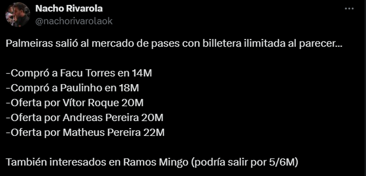 Mientras Boca y River sondean y (más allá del Xeneize a Carlos Palacios) aún no incorporan, en Brasil incorporan y ofertan a lo loco. Palmeiras aspira sin dudas a ser uno de los protagonistas en 2025, tanto en la Copa Libertadores como en el Mundial de Clubes.
