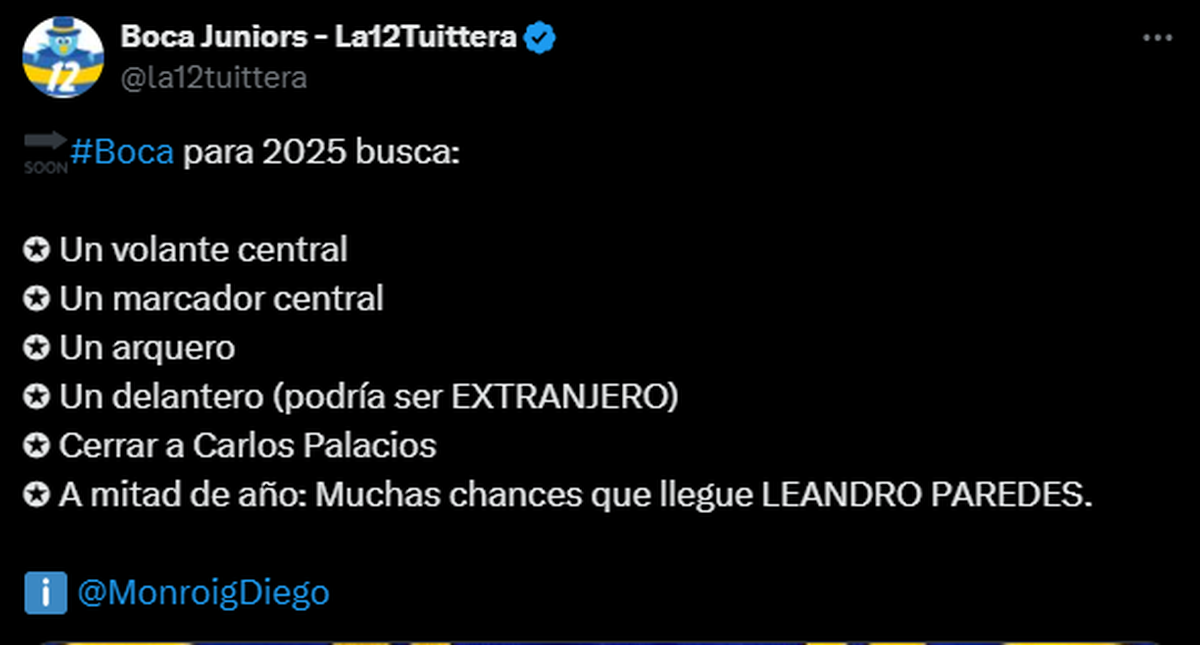 Boca no está atravesando un buen 2024 y lo mejor que le puede pasar es, por lo menos, obtener la clasificación a la Conmebol Libertadores del año que viene. Justamente con el afán de tener un mejor 2025, en el Xeneize ya se piensan refuerzos para el siguiente año y así lo filtró Diego Monroig, periodista de ESPN.