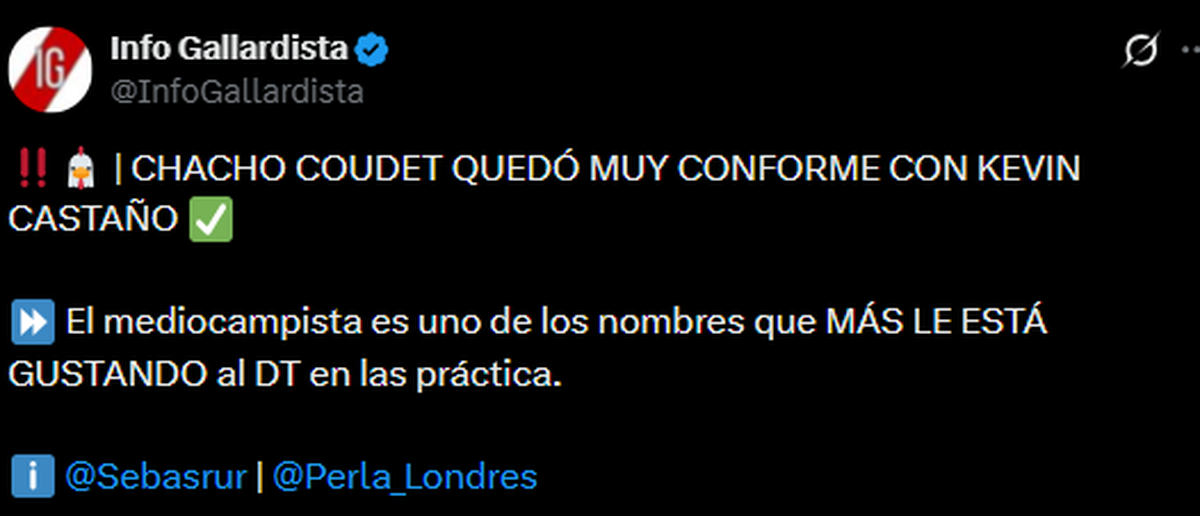 Otro de los jugadores mencionados por el periodismo fue el colombiano Kevin Castaño. Según el periodista Sebastián Srur, el entrenador quedó muy conforme con su rendimiento en los entrenamientos. “Chacho Coudet quedó muy conforme con Kevin Castaño. El mediocampista es uno de los jugadores que más le está gustando al DT en las prácticas”, señaló.