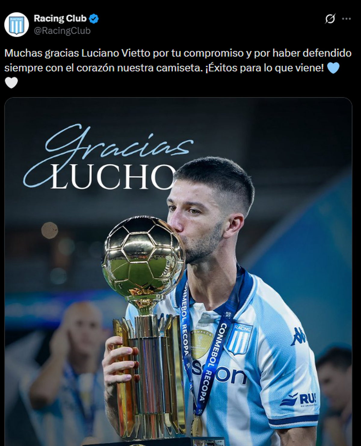 “Muchas gracias, Luciano Vietto, por tu compromiso y por haber defendido siempre con el corazón nuestra camiseta. ¡Éxitos para lo que viene!”, publicó el club de Avellaneda en sus redes sociales.