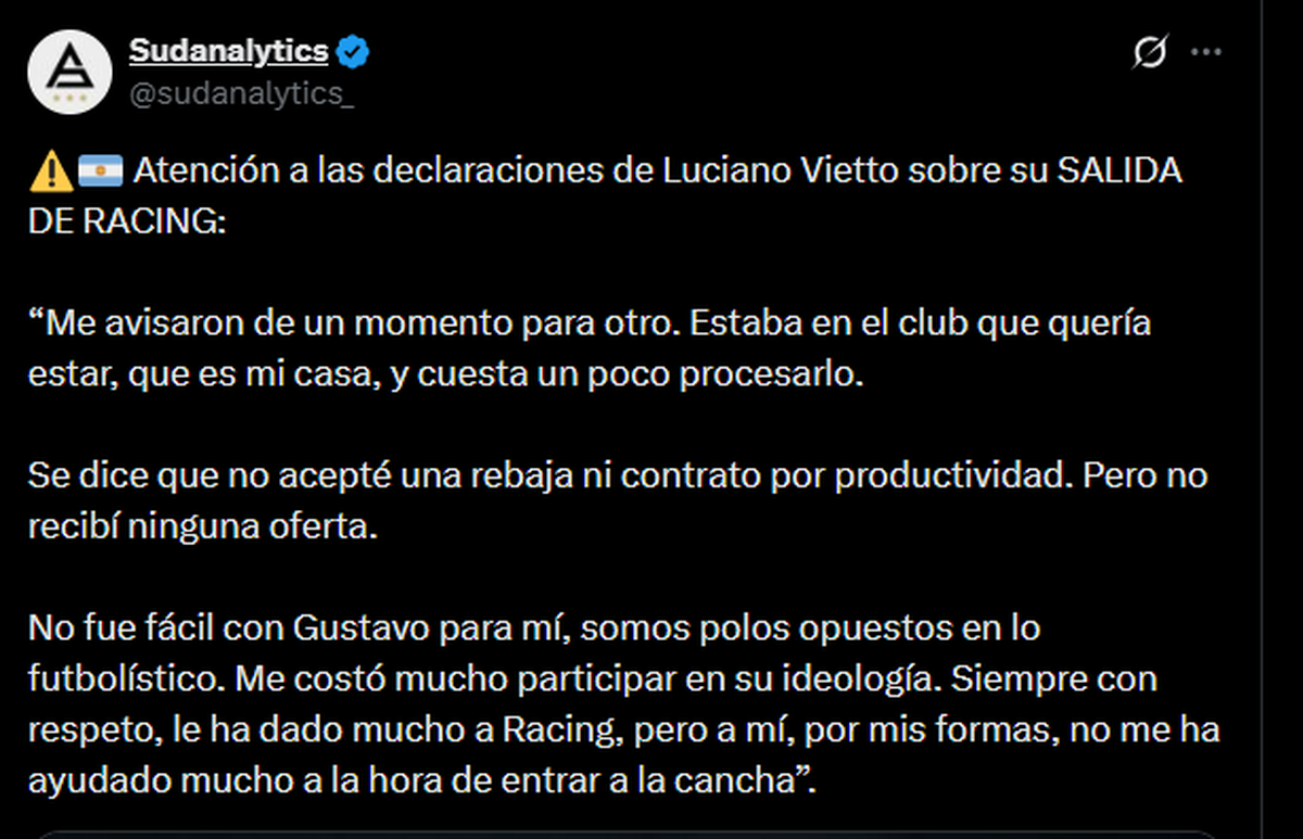 Luciano Vietto hizo declaraciones sobre Gustavo Costas que impactaron fuerte en el mundo Racing Club.