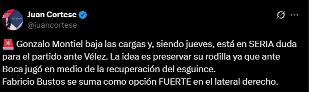 "Gonzalo Montiel baja las cargas y, siendo jueves, está en SERIA duda para el partido ante Vélez. La idea es preservar su rodilla ya que ante Boca jugó en medio de la recuperación del esguince. Fabricio Bustos se suma como opción FUERTE en el lateral derecho"
