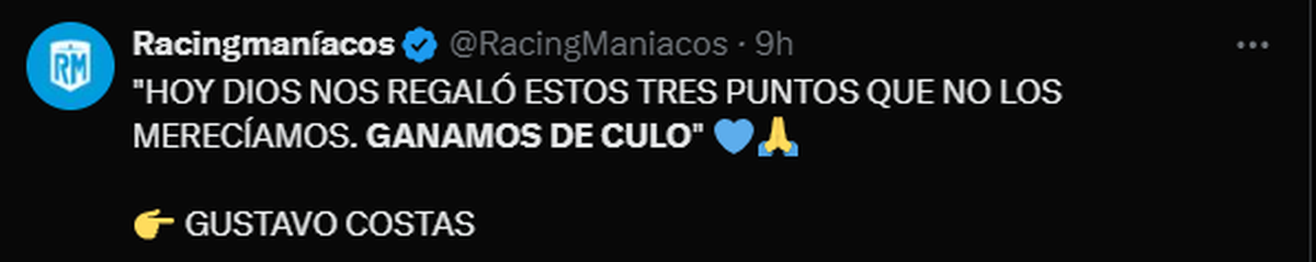 "Ganamos de culo. Esa es la definición. No voy a decir que jugamos bien. Nos matamos y los chicos corrieron, pero no merecíamos ganarlo para nada", dijo el DT de la Academia, dejando claro que el Tatengue merecía más que lo que obtuvo. "Pienso que ellos hicieron todo para ganar, son esos partidos que no merecés ganar y los ganás", completó.