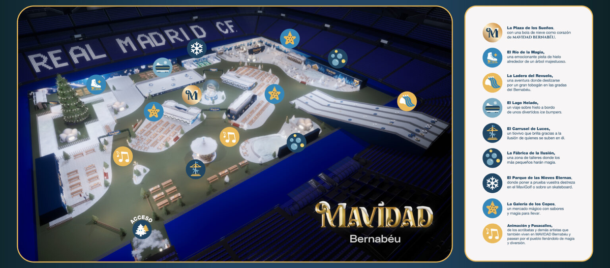 "Durante unos días, el estadio se transforma en un pueblo mágico lleno de luces, con actividades como pistas de hielo, toboganes, talleres y rincones por descubrir", cuenta el sitio oficial de MAVIDAD Bernabeu, que se realizará entre el 24 y el 31 de diciembre. "Un plan pensado para familias, amigos y para todos los que aún disfrutan la Navidad como cuando eran pequeños".