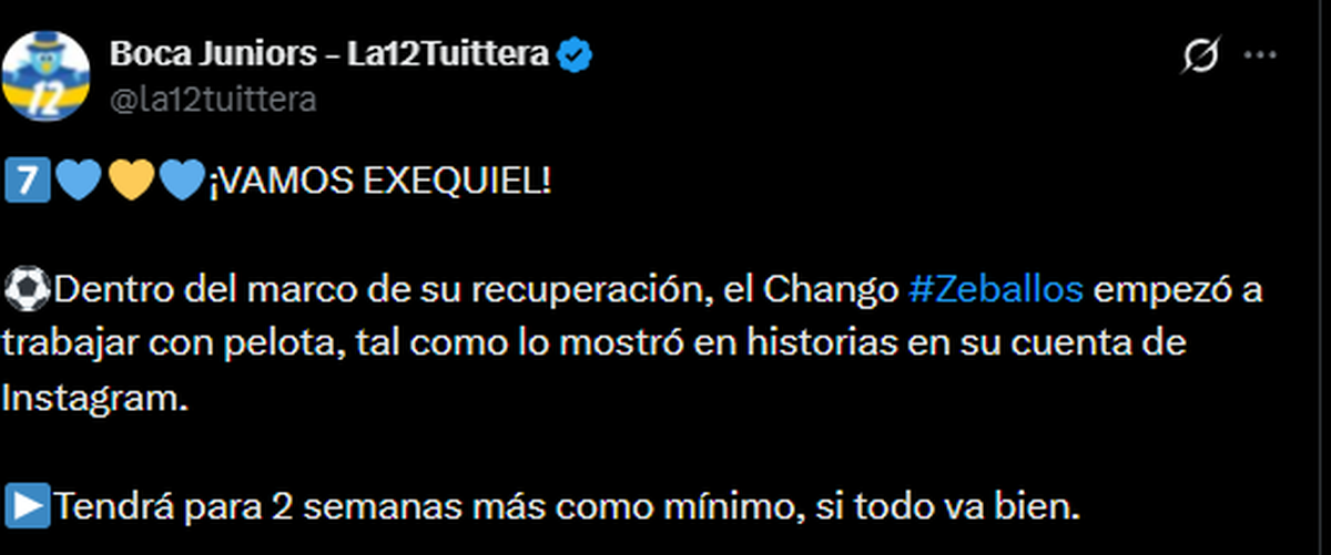 Sin embargo, en las últimas horas surgió una novedad alentadora. La cuenta partidaria La12 Tuittera informó: “Dentro del marco de su recuperación, el Chango Zeballos empezó a trabajar con pelota, tal como mostró en historias en su cuenta de Instagram. Tendrá para dos semanas más como mínimo, si todo va bien”.