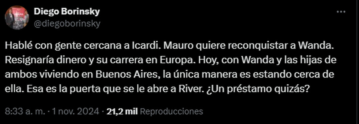 Hoy 1/11, el periodista Diego Borinsky (inmerso en el mundo River) complementó esta información y afirmó en su X personal: "Hablé con gente cercana a Icardi. Mauro quiere reconquistar a Wanda. Resignaría dinero y su carrera en Europa. Hoy, con Wanda y las hijas de ambos viviendo en Buenos Aires, la única manera es estando cerca de ella. Esa es la puerta que se le abre a River. ¿Un préstamo quizás?"