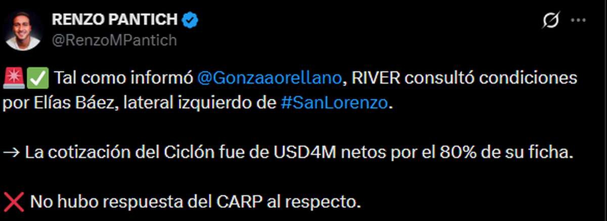 Fuentes cercanas a ambos clubes aseguran que River consultó por las condiciones del número 3, y desde San Lorenzo respondieron que pretenden 4 millones de dólares netos por el 80% del pase. De momento, el Millonario no avanzó con una nueva oferta, pero Báez es uno de los perfiles que gusta para competir con Marcos Acuña, quien hoy es titular indiscutido.