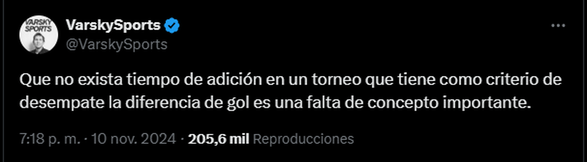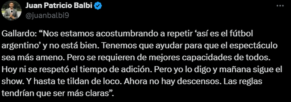 Y ojo con la última declaración: "y hoy, por ejemplo, termina el segundo tiempo a los 45 minutos. ¿Cómo va a terminar a los 45 minutos? No entiendo por qué. Había que respetar el tiempo de adición y no se respetó. Entonces como que listo, terminó. Eso no, no está bien"