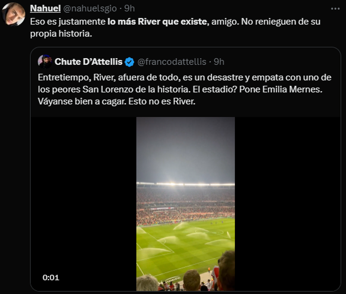 Chute D’Attellis hizo un posteo en X que rápidamente trascendió no solamente en los hinchas de River, sino también en los que no son del Millonario. "Entretiempo, River, afuera de todo, es un desastre y empata con uno de los peores San Lorenzo de la historia. El estadio? Pone Emilia Mernes. Váyanse bien a cagar. Esto no es River." publicó el periodista con un video en el que suena "perdonarte, para qué?" de fondo.