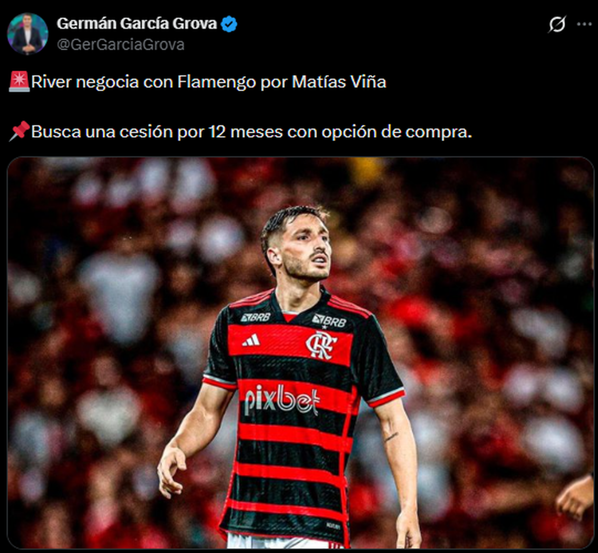Según informó el periodista especializado en mercado de pases Germán García Grova: "River negocia con Flamengo por Matías Viña Busca una cesión por 12 meses con opción de compra.".