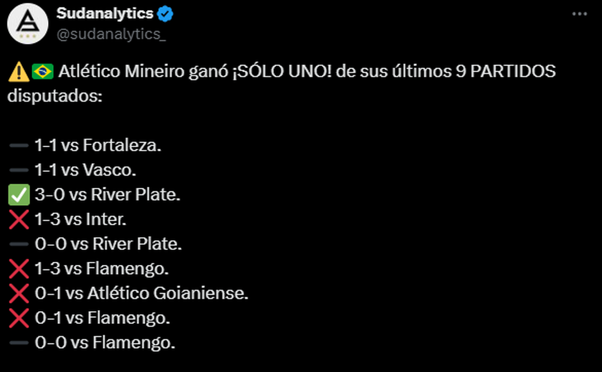 La actualidad de Atlético Mineiro poco tiene que ver con la realidad que debería tener un equipo que es finalista de la Conmebol Libertadores. Los últimos registros del Galo, hacen que River se lamente aún más su (justificada) eliminación en semifinales.