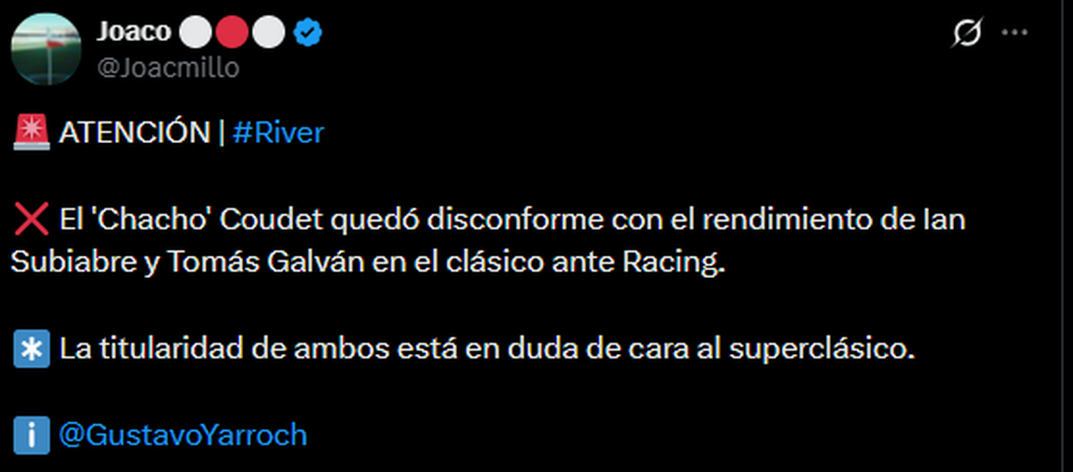 El periodista de ESPN aseguró:"Chacho Coudet quedó disconforme con el rendimiento de Ian Subiabre y Tomás Galván en el clásico ante Racing. La titularidad de ambos está en duda de cara al Superclásico."
