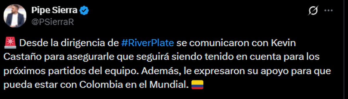 Por su parte, el periodista colombiano Pipe Sierra aportó otra versión: desde la dirigencia de River se comunicaron con el jugador para transmitirle tranquilidad y confirmarle que seguirá siendo tenido en cuenta. Incluso, le manifestaron su apoyo de cara a su posible participación con Colombia en el Mundial.