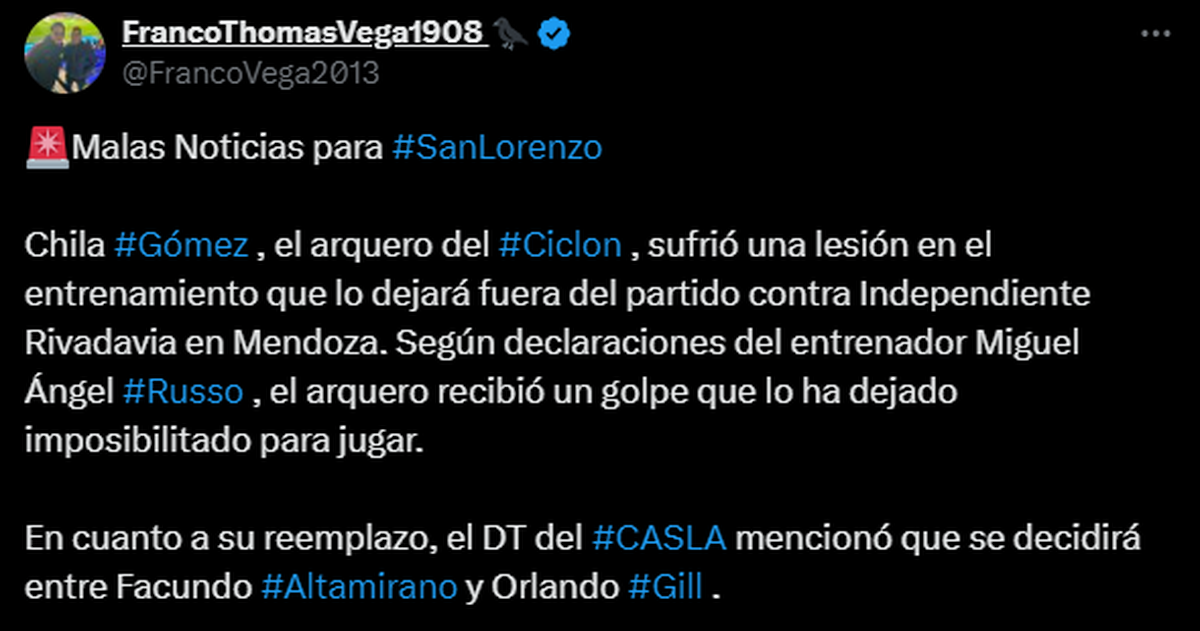 Por eso mismo, una declaración como la de Chila Gómez podría no ayuda al Presidente de San Lorenzo de cara a tener cierto peso en el fútbol argentino. Por eso mismo surge la duda de si hubo tirón de orejas luego de sus declaraciones, independientemente de su golpe que lo deja fuera del partido ante Independiente Rivadavia.